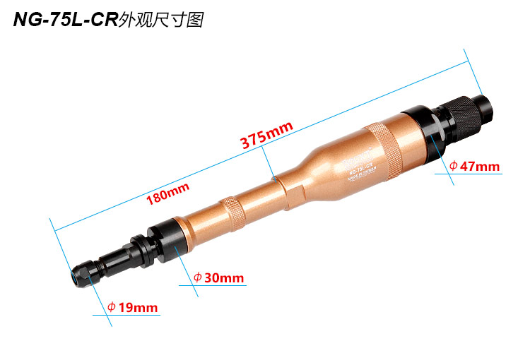 • 產品參數: 夾頭能力:M3,M6 【標配M6】 空載轉速:15000rpm 全 長:375mm 桿 長:180mm 桿 直 徑:30mm 重 量 : 1.40kg 耗 氣 量:0.6m3/min 【旋鈕開關/工業型】